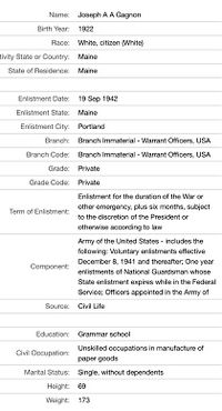 − | [[File:Albert-CampLeeVA-1942.jpg|right|thumb|200px|Al after basic | + | [[File:albert-enlist.jpg|left|thumb|200px|Al's enlistment record, showing at 19 he was 5'9" and 173 lbs]] [[File:Albert-CampLeeVA-1942.jpg|right|thumb|200px|Al after basic training at Camp Lee, VA before shipping out to the South Pacific theater]] Albert successfully enlisted in the army on September 19, 1942, as Serial# 11097328. We still have his dog tags, which list him as Joseph A A Gagnon. In addition to serial number, dog tags also listed the father’s name and address. This was presumably to know where to send the body, in case of death or serious injury. In the war, he was posted to 3747th QM Truck Company, Base A, APO 928, in the South Pacific as a member of the truck company. |